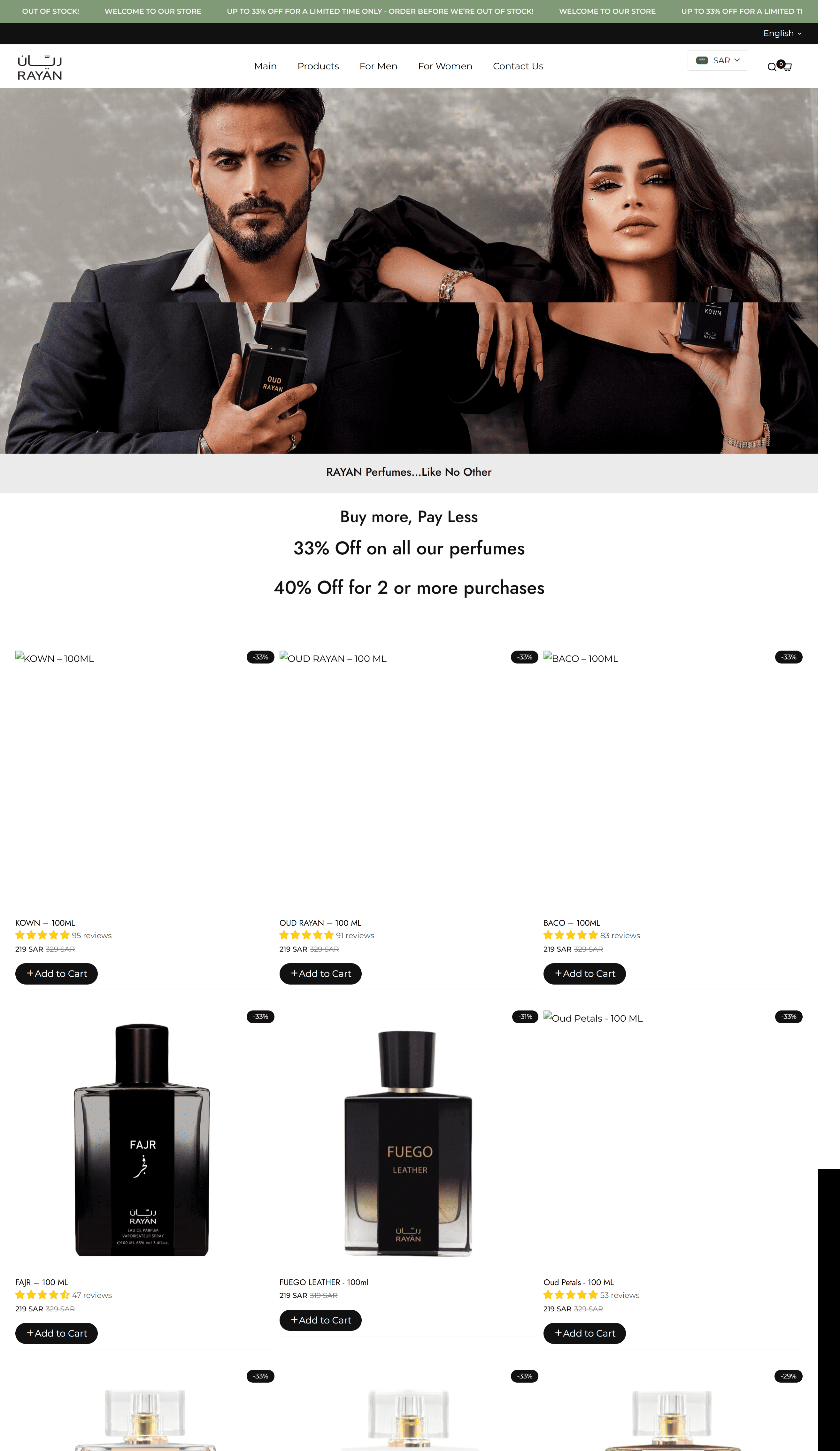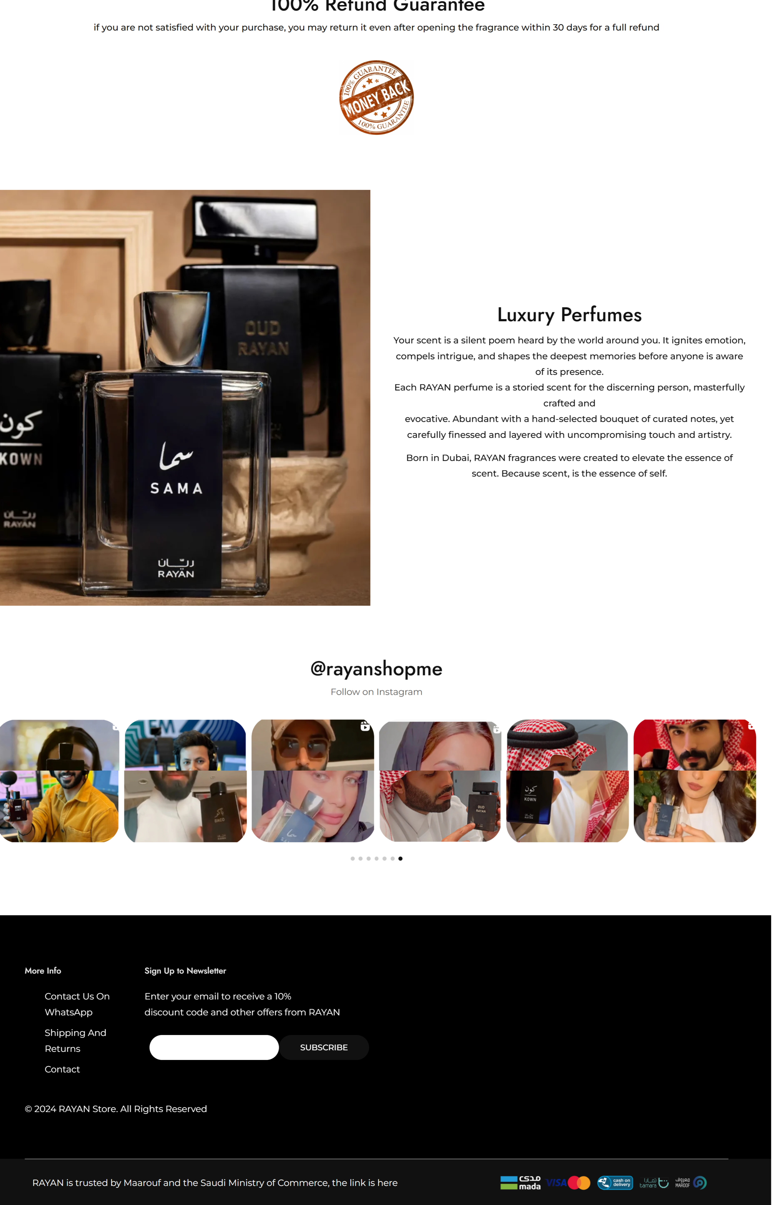 Rayan Perfumes is a UAE-based fragrance brand established to craft luxurious, long-lasting scents inspired by Arabian heritage and modern elegance. The brand offers a diverse collection of perfumes that blend traditional oud and musk with contemporary notes. Known for its premium quality, elegant packaging, and captivating aromas, Rayan Perfumes has built a strong presence across the GCC.