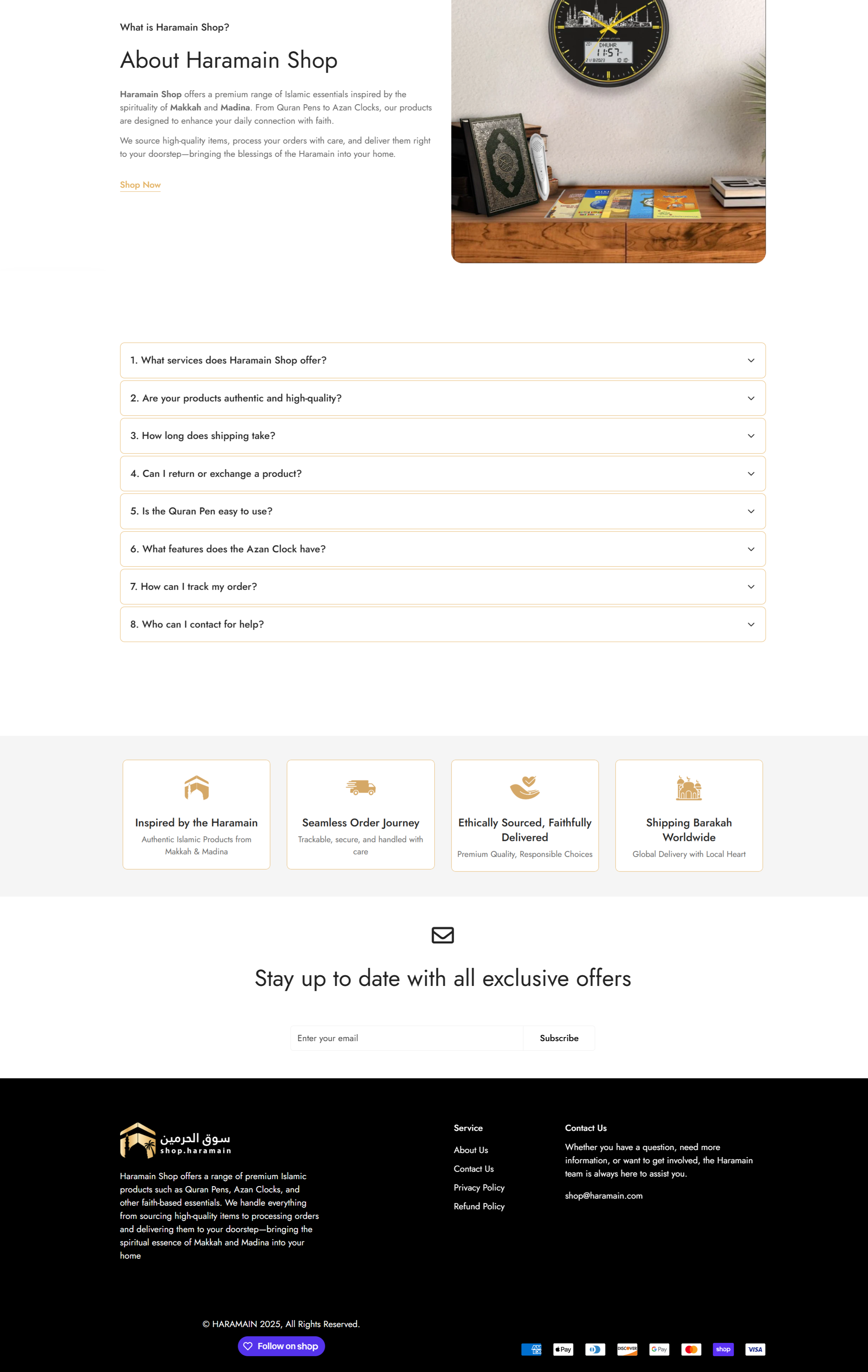 Haramain Shop based in UAE offers a range of premium Islamic products such as Quran Pens, Azan Clocks, and other faith-based essentials. They handle everything from sourcing high-quality items to processing orders and delivering them to your doorstep—bringing the spiritual essence of Makkah and Madina into your home.