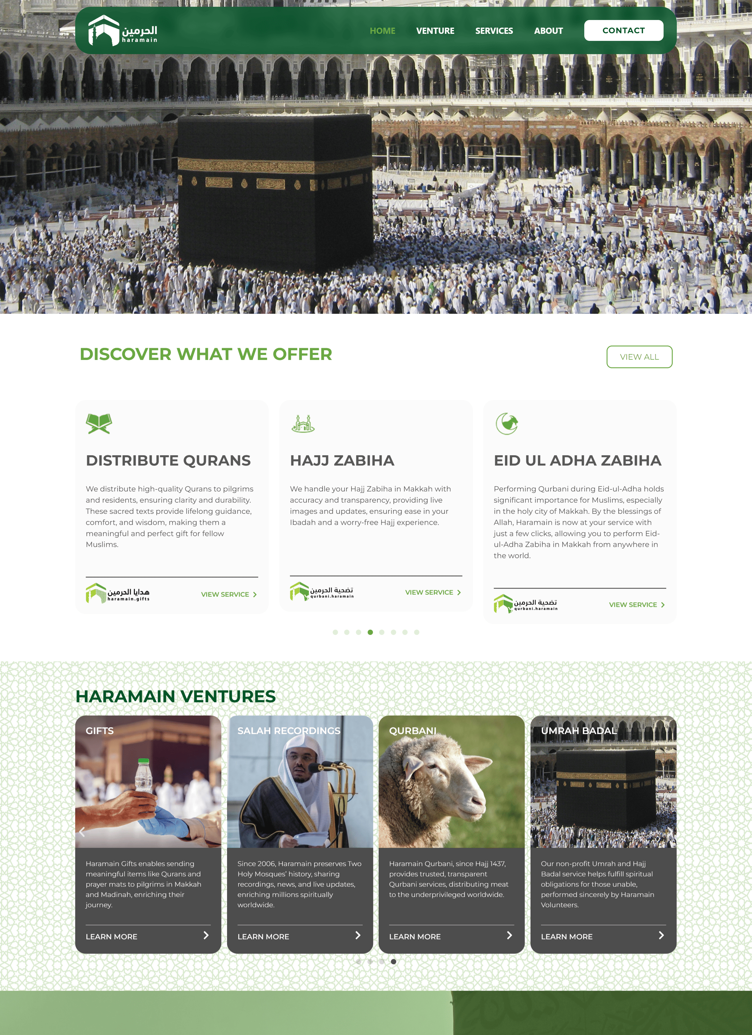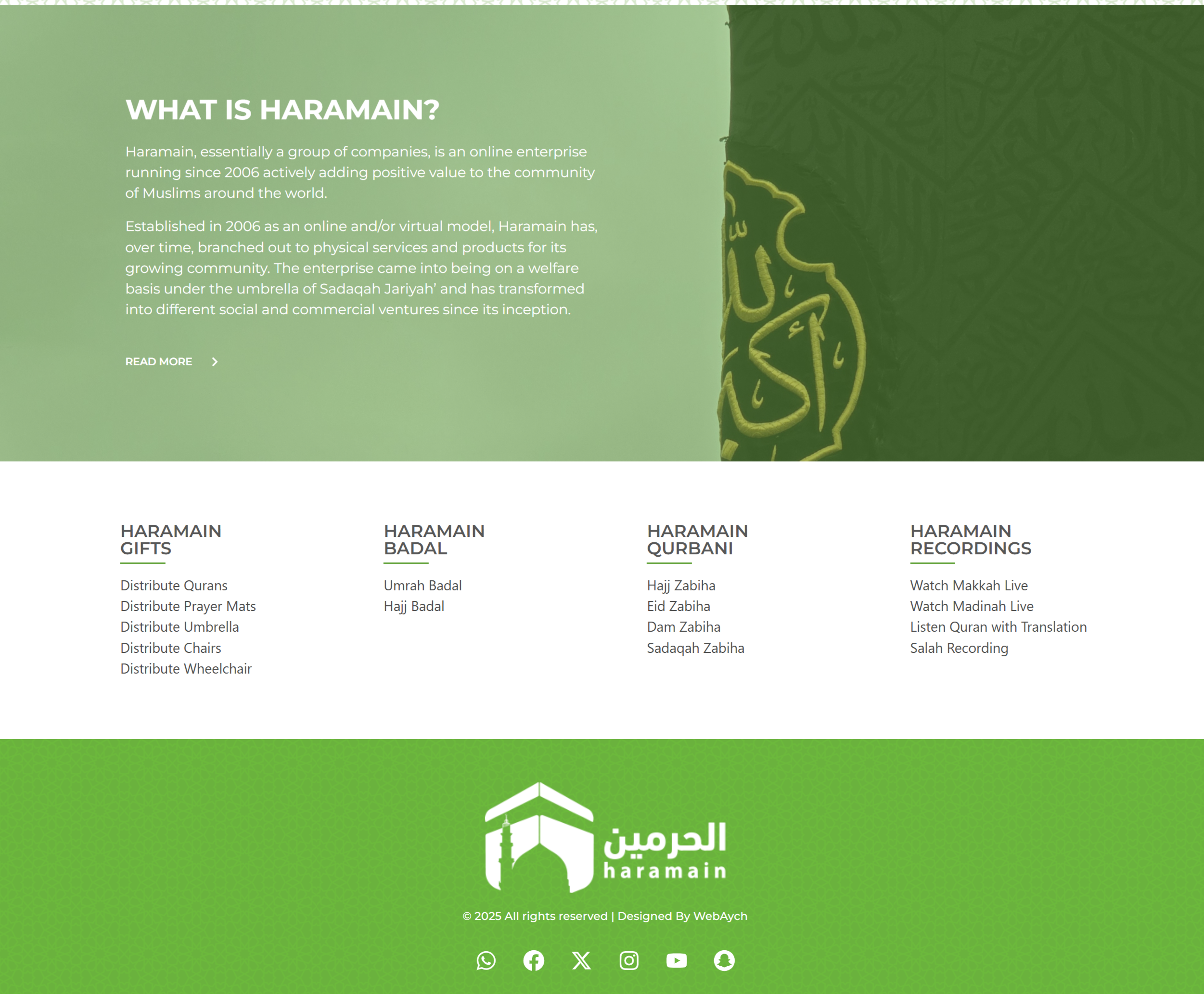 Haramain is a Saudi Arabia–based service platform dedicated to assisting pilgrims with convenience, comfort, and care during Hajj and Umrah. The brand offers a wide range of services including Hajj and Eid-ul-Adha Zabiha, Sadaqah, and Dum sacrifices, as well as the distribution of Qurans, chairs, prayer mats, and umbrellas to pilgrims. With a mission to make every pilgrim’s spiritual journey more meaningful and worry-free, Haramain combines trust, transparency, and compassion — enabling Muslims worldwide to contribute and perform their religious duties in Makkah with ease and authenticity.